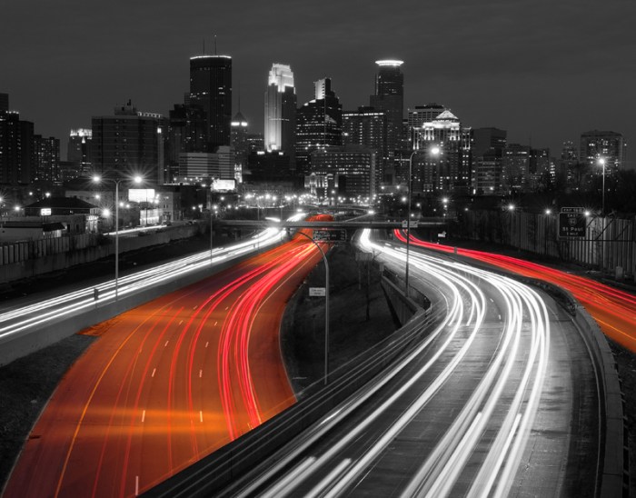 Below are two of the images I shot during the evening. The first was shot from a freeway overpass south of Minneapolis to capture the light trails in and out of the city. The image looked better in color than B & W, but I didn’t think it had the same POP as it does in B & W with color added back in to focus on the red light trails. (The white trials were similar in both color or B & W).