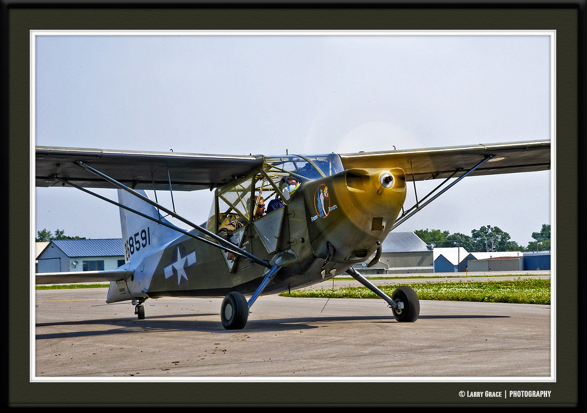 The L-5 was primarily constructed from steel tubing and plywood covered with doped cotton fabric. This image was taken at the Eden Prairie Air Expo as it was being guided to a parking space on the ramp.