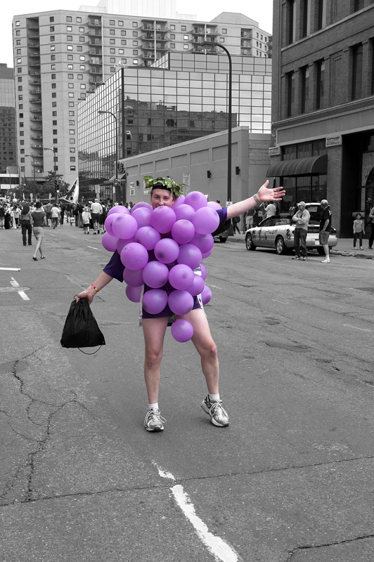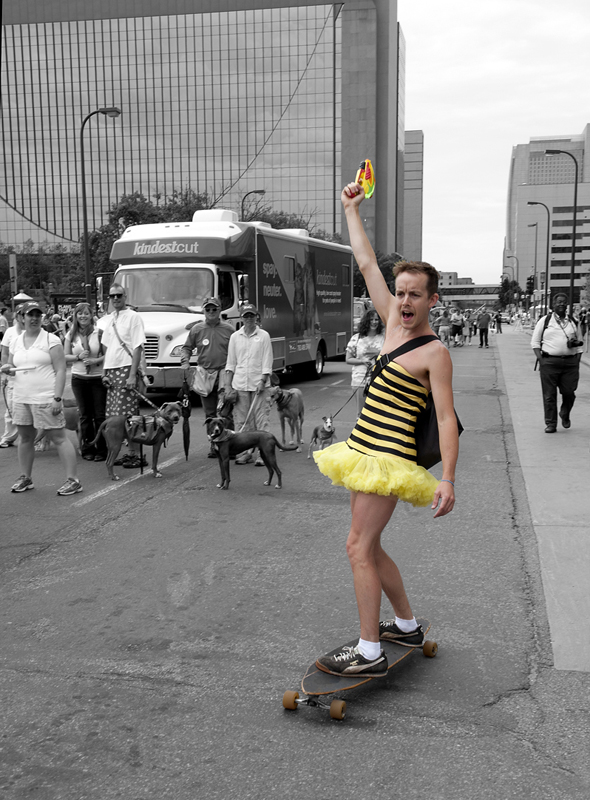 I live right in downtown Minneapolis close to the finish of the Gay Pride parade held there every June. This year my wife’s employer had a float in the parade and asked me to photograph the participants to send to their corporate headquarters in Chicago. So I ended up actually being in the parade taking pictures of the float/riders as it went over the parade route.