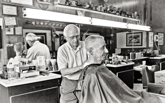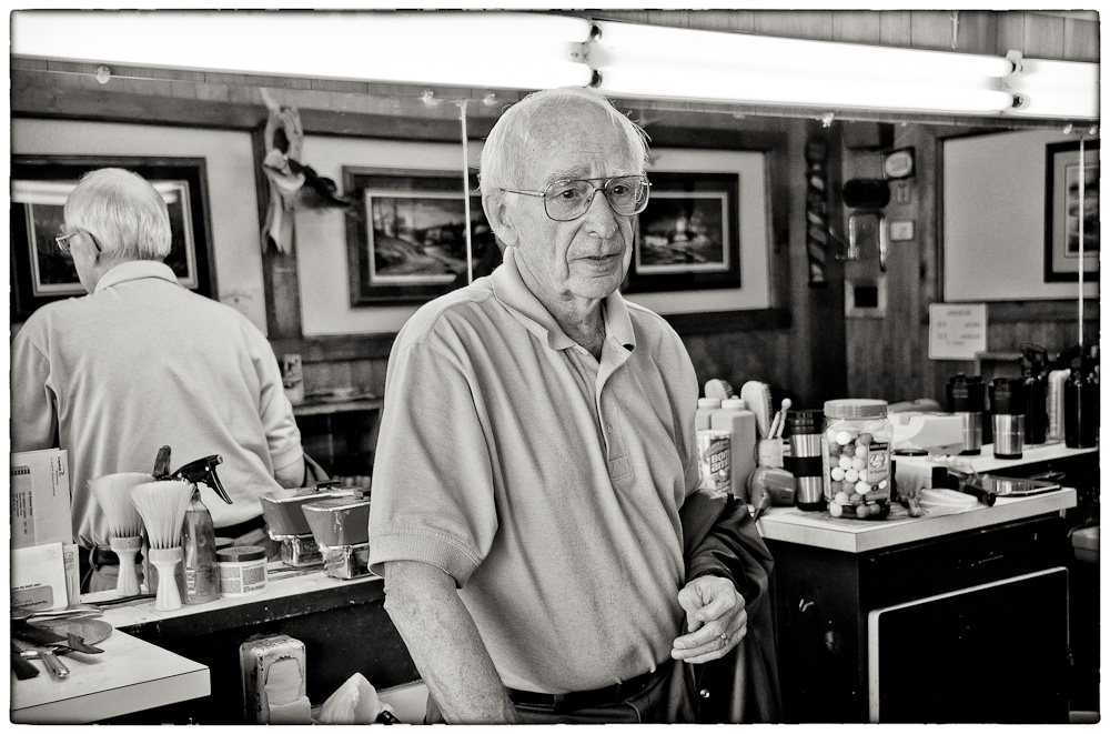These last two images were taken in Willmar Minnesota while shooting for the groups Main Street Project.  I was nervous to walk into the shop alone.  So I asked John Olson to come with me and he agreed as long as I did all the talking.  Turned out there was nothing to worry about as Denny was a very friendly guy and was happy to let us in to shoot. Some of the customers did not want their picture taken, but this guy with the flat top was a great subject.  It was difficult shooting inside in a tight space with a lot of mirrors.   I shot this in color, but later decided to try BW to give it a more intimate feel that I think tells the story better.