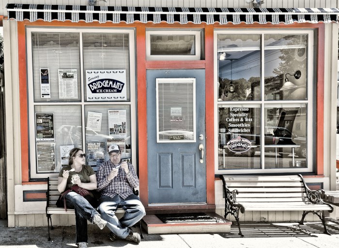 This was shot in Lanesboro, Minnesota.  I saw the shop and wanted to photograph it, but I thought it just needed something to make it work.  So when I walked by later and saw these two sitting out front the shot I wanted was there.   I approached the couple and asked if I they minded if I took some pictures with them sitting there.  They were friendly, but misunderstood what I was asking and got up to leave so I could shoot with them out of the way.  They were a bit uneasy about being in the picture, but nevertheless asked what I wanted them to do.  I told them to relax and enjoy their ice cream.  I shot several pictures.  In the first ones the couple was looking at the camera and sort of posing.  Finally, they relaxed and I got this casual looking shot that captured my idea of a summer afternoon at the ice cream shop.