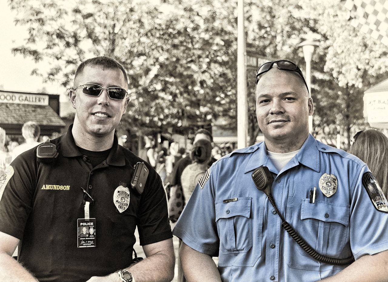 This is from the State Fair near the end of the first day of the fair.  I was nervous about approaching cops, so even though I saw something interesting I went on by.  But I kept thinking about the shot I saw.   When we came back through later the cops were still there.  I just went over and asked if they would mind if I “shot them”.   They said sure and seem pleased (I think that shows in the shot); the guy on the right even lifted his sunglasses to show his face better.