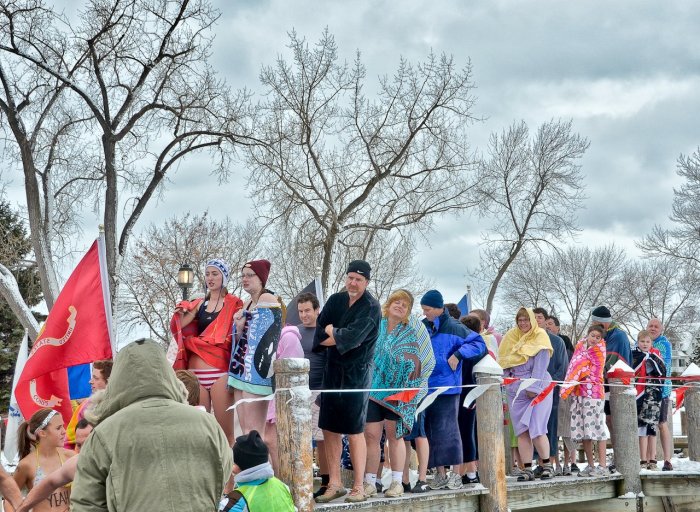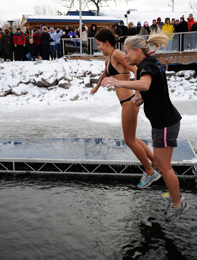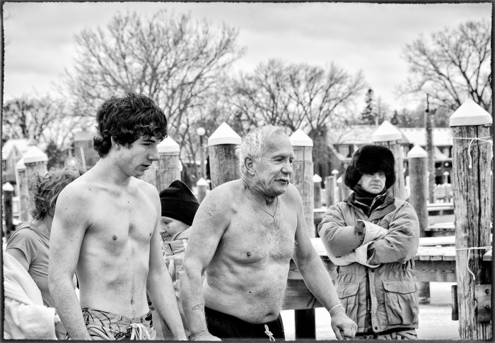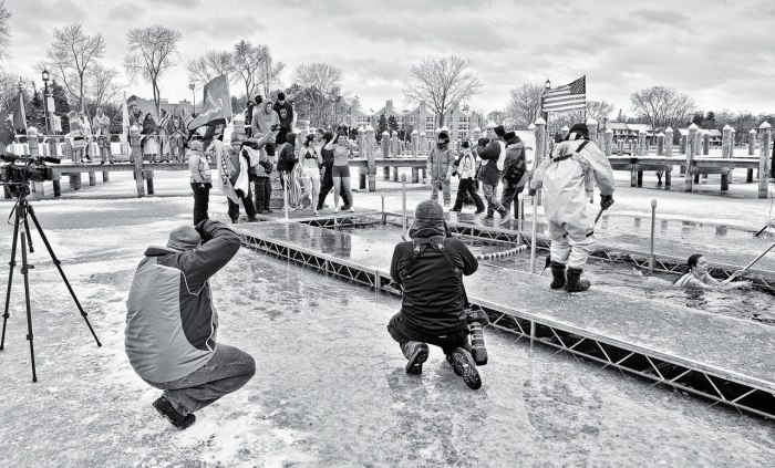 This year the temperature was actually very balmy in the 20’s. But there was bitterly cold wind coming across the lake that made it seem far colder and much more inhospitable than in previous years. But no matter what the temperature, the cold conditions and cold water make for some great photo ops. Below are some images captured by two of our members that document this crazy event. Winter in Minnesota, not for the weak!