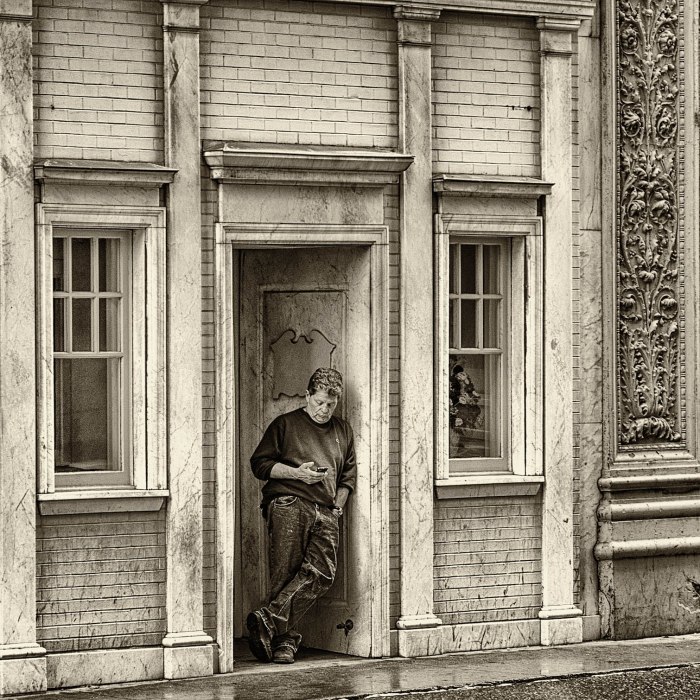 Man with Cell Phone: Another downpour, it rained a lot on this trip, I saw this man contentedly waiting out the passing the storm while standing in the doorway.