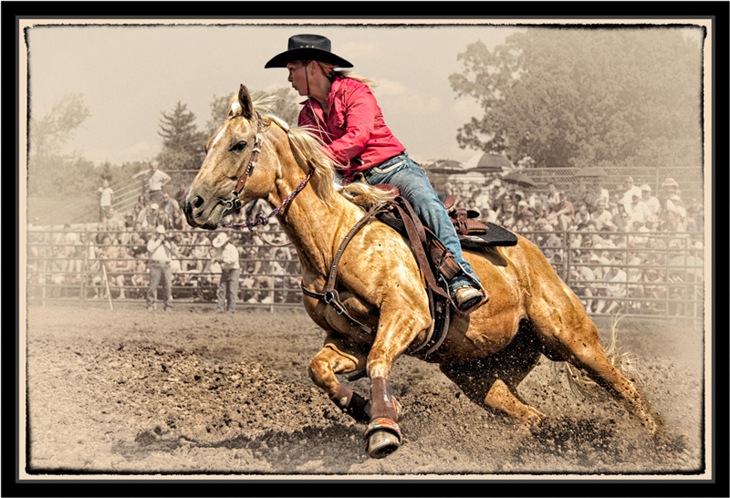 Dirt flies as the barrel racer approaches a turn, the horse seemingly defies gravity by lowering itself nearly to its side, yet the skill of the rider remains balanced in the saddle. A real challenge to get this image in the camera in a fraction of a second. The tonality and luminance of the image are adjusted through the creation of duplicate layers of the original image. These duplicates are then processed by adjusting color, texture and detail. Multiple layers of these variations are made into a composite to complete the finished image. From a Professional Rodeo Cowboy Association event.