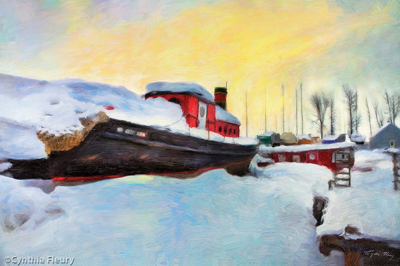 This image was captured in Bayfield, Wisconsin, on a frigid January day with low light at a temperature of -20º F. I envisioned the beautiful flaming sun rising on this vividly colored snowbound tugboat as a painting on canvas. To enhance the original photograph, I created digital paintbrushes to produce a thick paint style with acrylic paint accents and acrylic gel texture which provides the impasto look and feel.