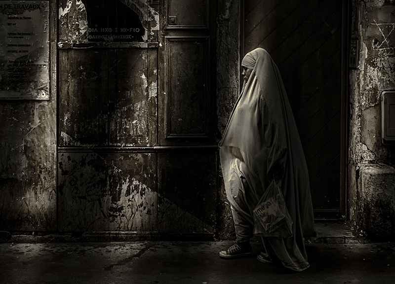 I came upon this woman as she was walking along a quiet, narrow street in a northern banlieue of Paris. It was late in the afternoon and I had gone there myself to escape from the block-away hustle and noise of that day’s market crowd. For a brief while I stood and enjoyed the relative silence, noticing the street’s stark shadows that were interspersed with bands of light. The woman appeared, not hurrying, but seemingly pleased as well to be escaping the noise and hustle of the crowded market. I converted the image to black and white to enhance the tonalities and to increase the contrast between the shadows and light.