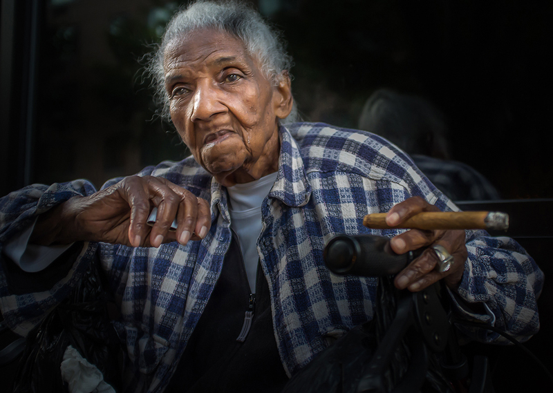 I met Lillian one early spring evening in 2013 on the Upper West Side of Manhattan. She was sitting outside on the sidewalk alone in a wheel chair. As we talked, she sounded happy and content though her eyes watered. When I noticed her lit cigar, I asked if I might take her photograph. She smiled and then agreed with a wave of her hand, the one holding her cigar. As I bent low and brought her face into focus, she began to speak to me about her past, telling me she had years ago emigrated from Cuba and had no plans to ever return. The overall image was underexposed with the intent of subsequently enhancing critical highlights.