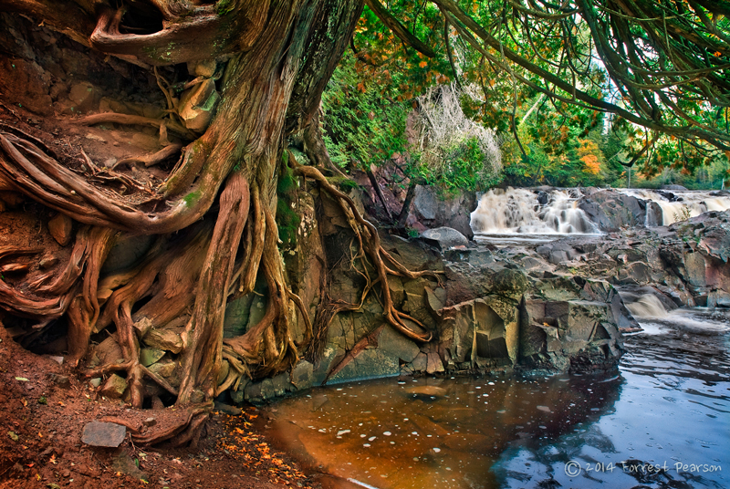 This image was taken at Two Steps Falls in Tettegouche State Park on the North Shore of Lake Superior. I was attracted by the rough texture of the roots covering the rocks. The roots, rocks, waterfalls and the hint of fall combine to create a sense of the natural beauty of the North Shore. This image was created from a composite of four images taken at different exposures. Together, they capture the range of light from the dark shadows under the tree to the sunlit waterfalls. I was fortunate to be there at a time when there were no other people around and so I spent a very pleasant hour setting up and capturing this image.